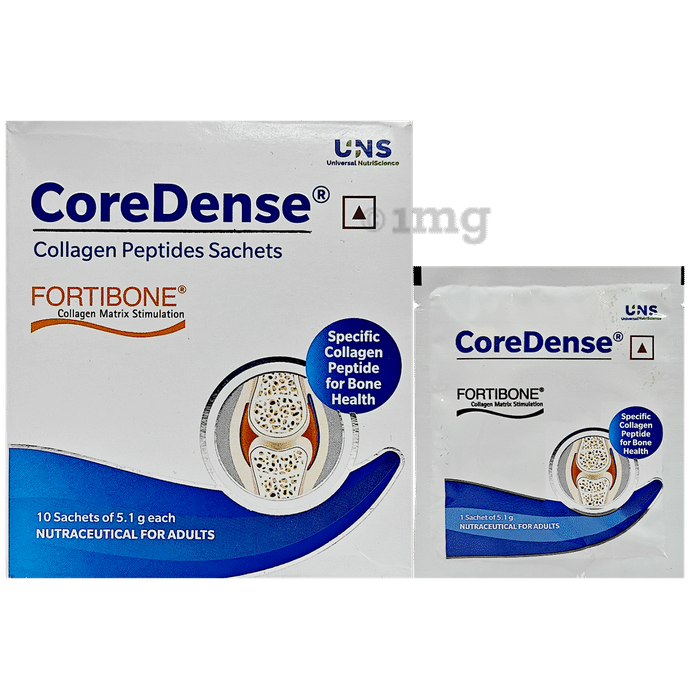 CoreDense Collagen Peptides Sachets are designed to help support bone health by providing specific bioactive collagen peptides (FORTIBONE®). This nutraceutical supplement may help support bone matrix stimulation and contribute to the maintenance of bone strength. It is intended for adult use and offers a convenient sachet format for easy consumption.