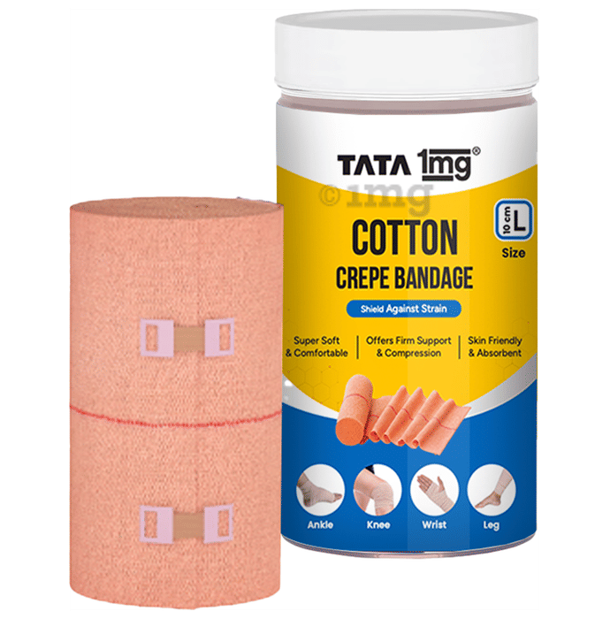 Tata 1mg Cotton Crepe Bandage is suitable for use as support for sprains and strains in joints and muscles. It works as a moderate compression bandage for knee swelling, ankle swelling, and other relevant injuries.