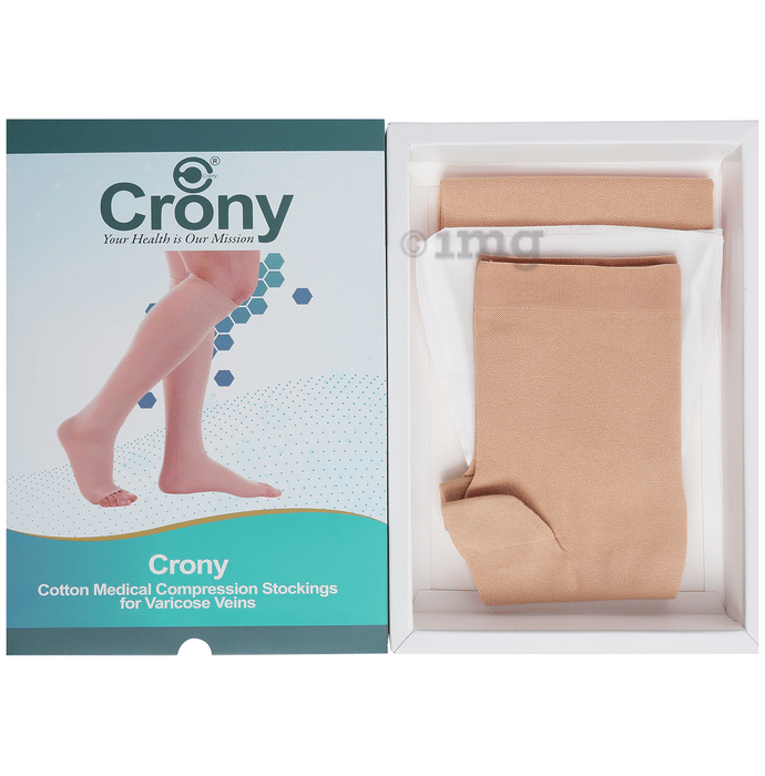 - Crony Cotton Varicose Vein Stockings provide Class II (23-32 mmHg) compression level, Color - Beige, Open Toe, Material Composition: 25% Cotton, 45% Nylon, 30% Spandex