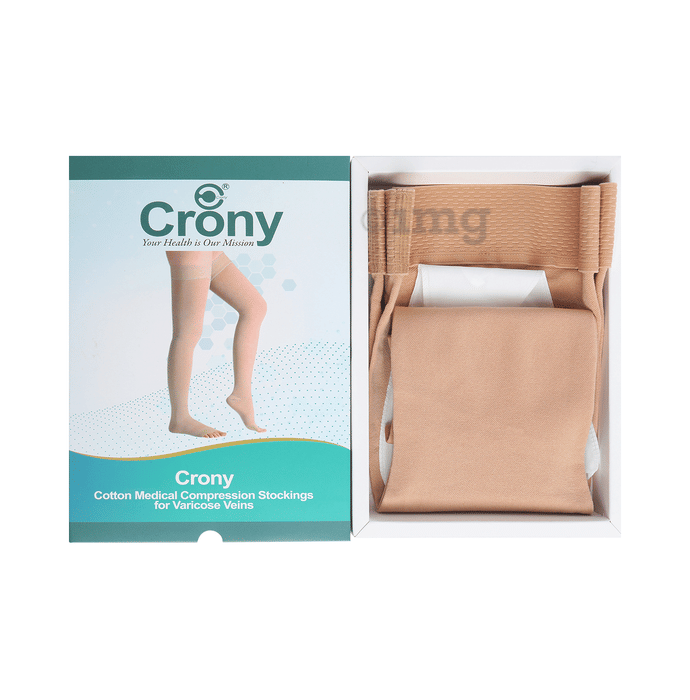 Crony Thigh Length Cotton Medical Compression Stocking Medium is designed to provide effective compression therapy by applying gentle pressure on the legs to promote blood flow and manage swelling. It is made from premium-quality cotton blended with nylon and spandex, offering comfort, breathability, and durability for daily wear. The open-toe design ensures ventilation and comfort, making it suitable for both men and women.