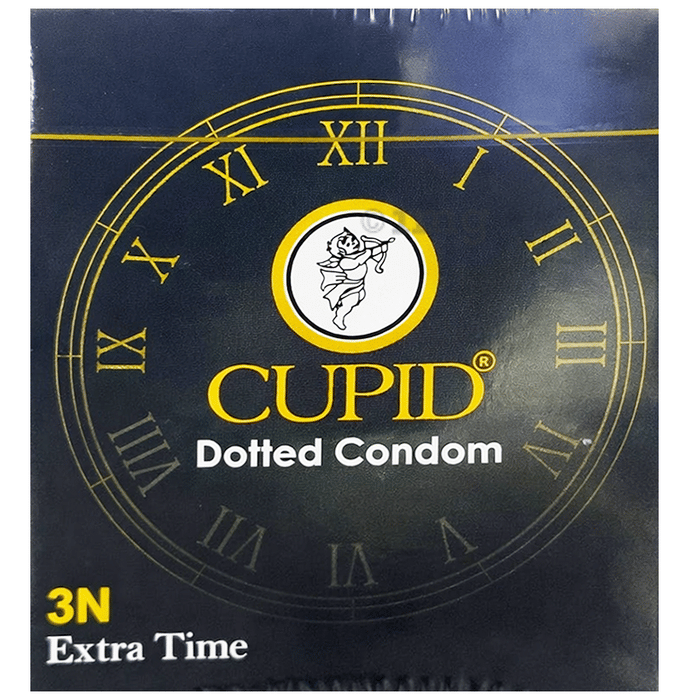 Cupid Dotted Condom Extra Time is a lubricated condom made from natural rubber latex, designed with a dotted surface to enhance sensation. It features a straight-walled, teat-ended design that ensures a secure fit and ease of use. The condom is electronically tested for quality and safety, offering reliability during use. With added lubrication and vanilla masking, it helps improve comfort and overall experience.