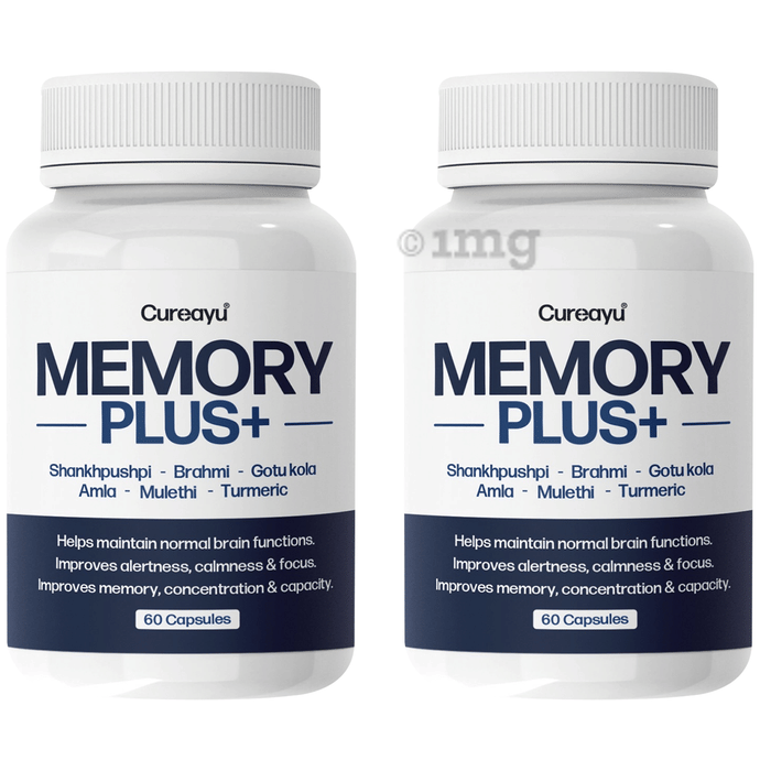 Cureayu Memory Plus+ Capsule (60 Each) is a herbal blend formulated with botanicals that can support mental performance and overall brain wellness. Shankhpushpi and Brahmi may help support concentration, focus, and learning capacity. Gotu Kola contributes to maintaining cognitive function and clarity of thought. Mulethi and Amla help support vitality and nourishment, while Turmeric contributes antioxidant properties that support general mental well-being. Together, these herbs can help maintain alertness, calmness, and balanced cognitive performance for daily mental tasks.