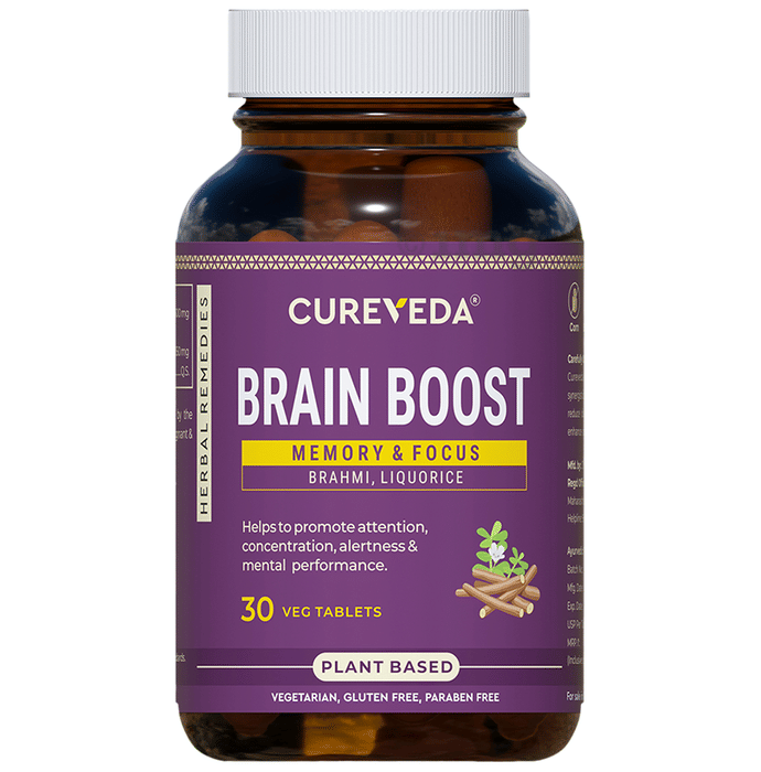 Cureveda Brain Boost Tablet helps support mental wellness and contains ingredients that support focus, clarity, alertness and memory. Brahmi is the leading herb in Brain Boost which contains an active ingredient Bacosides.