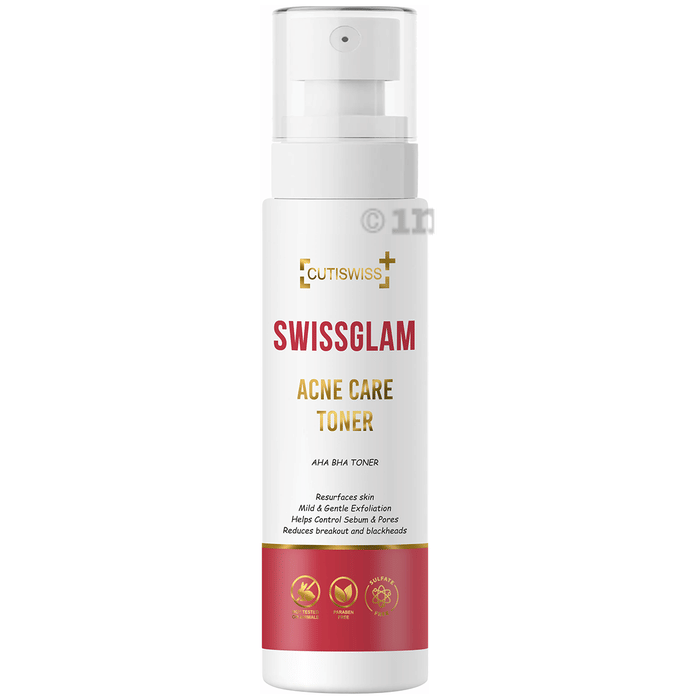 Cutiswiss Swissglam Acne Care Toner is a refreshing toner designed to support clearer and more balanced skin. It contains a blend of exfoliating and hydrating ingredients, including glycolic acid, lactic acid, mandelic acid, and salicylic acid, along with niacinamide, hyaluronic acid, aloe vera, and green tea extract. This toner helps remove excess oil and impurities, supports pore clarity, and promotes smoother skin texture. Suitable for acne-prone and combination skin.
