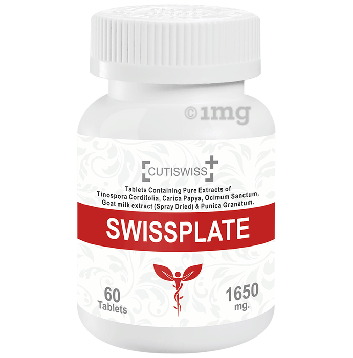 Cutiswiss Swissplate Tablet is a nutraceutical supplement formulated with Tinospora Cordifolia, Ocimum Sanctum, Goat Milk Extract, Carica Papaya, and Punica Granatum. This blend of botanical and natural extracts may help support overall well-being and is intended for use under medical supervision. Each ingredient in the formulation is known for its nutrient-rich profile and may assist in supporting immune health, general vitality, and wellness.