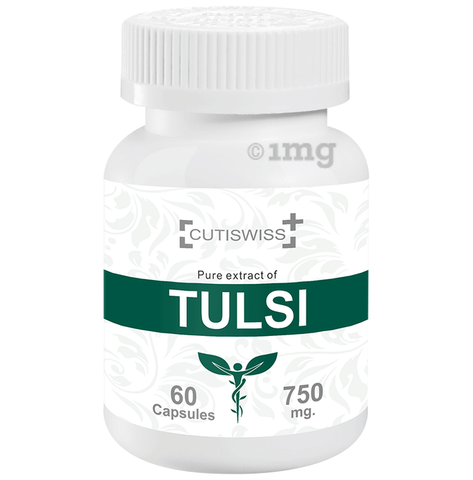 Cutiswiss Tulsi 750 mg Capsules is formulated with Tulsi (Ocimum tenuiflorum) extract, which contains antioxidants and bioactive compounds that may help support immune function, respiratory wellness, and overall well-being. Tulsi may assist in managing stress, supporting relaxation, and contributing to general health. It may assist in maintaining respiratory comfort and supporting detoxification and cellular protection. This supplement can be included as part of a balanced diet to help maintain immune defence and overall vitality.