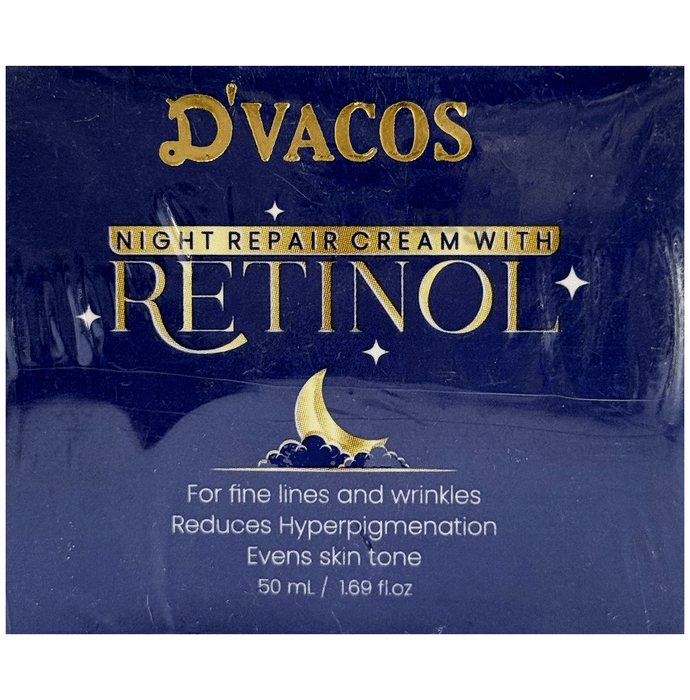 D'Vacos Night Repair Cream with Retinol is formulated with a blend of retinol, vitamins, peptides, and hydrating agents that can help in maintaining skin firmness and texture. It is rich in antioxidants that can help in supporting skin’s natural cell functions and maintaining a supple appearance. The formula can help in keeping the skin nourished overnight and may support a smoother and more even look when used as part of a regular night-time skincare routine.