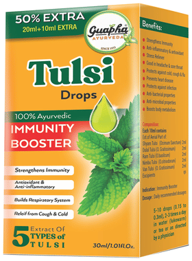 Dabur Tulsi Drop contains extracts of 5 types of tulsi leaves. Tulsi has antioxidant and antimicrobial properties. According to Ayurveda, tulsi supports digestive and skin health.