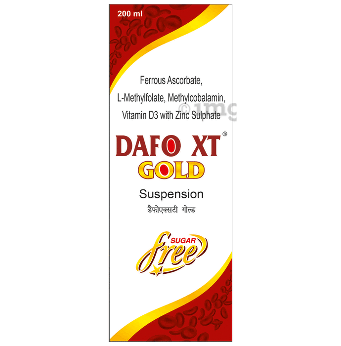 Dafo XT Gold Oral Suspension Sugar-Free is a health supplement that helps prevent low iron levels in the body. It supports the formation of red blood cells and is useful for anaemia.