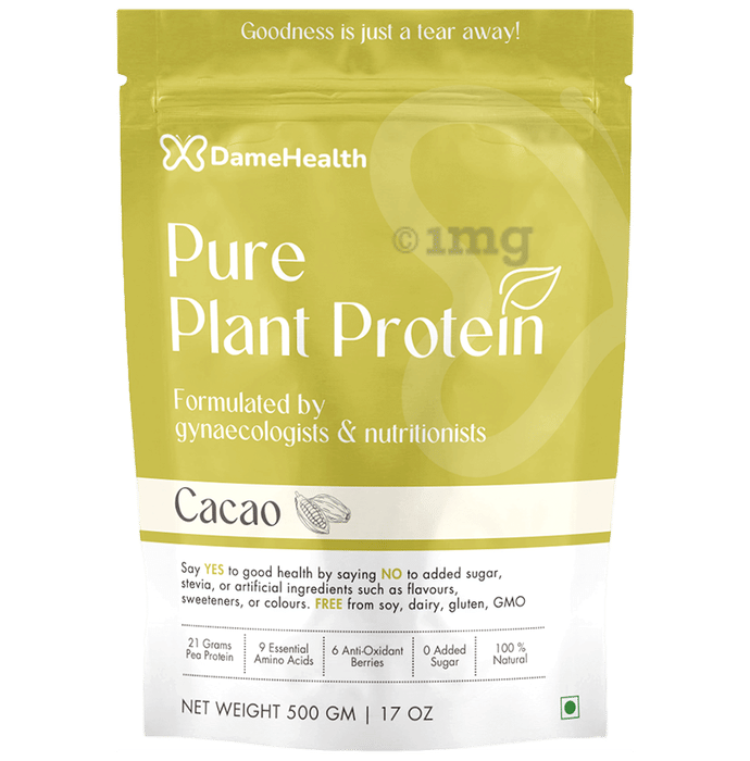 Dame Health Pure Plant Protein Cacaois designed to complement women's nutritional requirements at different stages of life. Each serving delivers 24 grams of pea protein isolate, providing essential amino may help support daily nourishment. The blend includes ginger, fennel, and cumin, known for their digestive properties. Free from artificial sweeteners, added sugar, and preservatives, this protein powder can help offer a clean, plant-based choice.