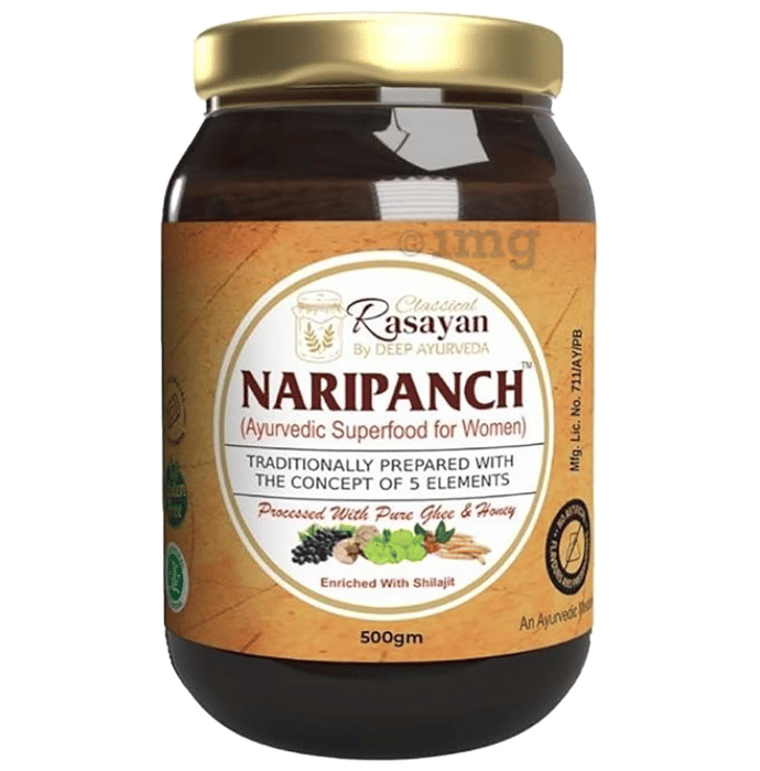 Deep Ayurveda Naripanch: Deep Ayurveda Naripanch is an Ayurvedic paste formulation designed with the concept of the five elements and contains a carefully selected blend of herbal ingredients processed with pure ghee and honey and enriched with Shilajit. This formulation can support overall vitality and wellness in women through a combination of botanical ingredients, including Ashwagandha, Shatavari, Safed Musli, and more. When taken regularly, it can support energy, digestion, and physiological well-being as part of a broader wellness regimen. Key Ingredients: Each 500 g contains: Shatavari–47 g, Sunthi–2.157 g, Elaichi–2.825 g, Safed Musli–2.135 g, Gokhru–2.135 g, Vidarikand–2.135 g, Pipali Badi–2.135 g, Mulethi–2.157 g, Shilajit–0.47 g, Vansh Lochan–2.135 g, Ashok–11.860 g, Lodhra–0.269 g, Ashwagandha–11.860 g, Anantmool–4.75 g, Vasa– 4.745 g, Amla–38.0 g, Kachnaar–11.860 g, Kishmish–9.49 g, Pure Ghee–32 g, Sesame Oil–8 g, Sugar Cane (Jaggery)–Q.S. Key Benefits:
