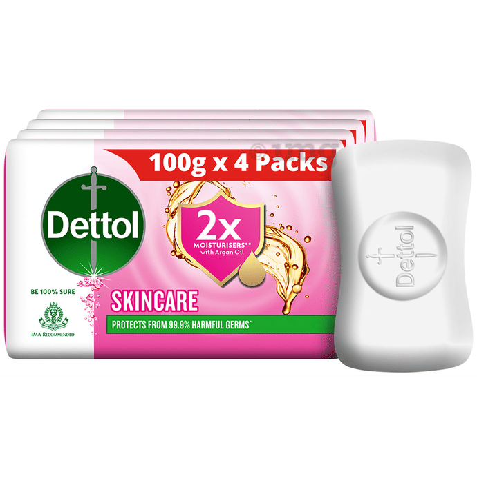 Dettol Skincare Moisturizing Beauty Mega Saver Pack of Bathing Soap Bar (100gm Each) is enriched with 2X moisturisers and Argan oil, gently cleanses your skin while offering 99.9% protection from harmful germs, including bacteria and viruses. Dettol’s trusted germ defense formula acts as a shield against unseen germs, helping you stay healthy every day. Formulated with 80% naturally derived ingredients and dermatologically tested, it leaves your skin soft, nourished, and hydrated. Recommended by the Indian Medical Association (IMA), this soap promotes better personal hygiene with every use.