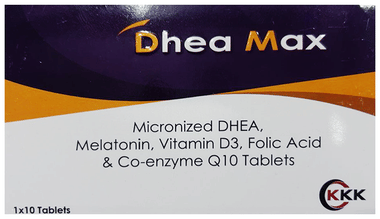 Dhea Max Tablet is a dietary supplement which combines micronized DHEA (Dehydroepiandrosterone), melatonin, vitamin D3, folic acid, and coenzyme Q10. This formulation supports hormone balance and promotes healthy sleep patterns and circadian rhythm regulation. It supports bone health, immune function, and mood regulation. It has powerful antioxidants that support cellular energy production and reduce oxidative stress. Together, these ingredients promote overall health, vitality, and well-being.
