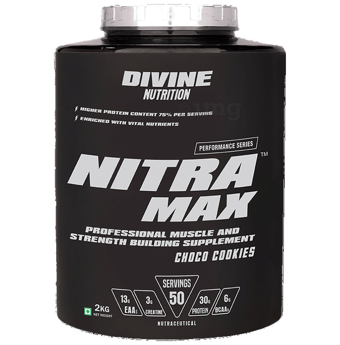 Divine Nutrition Nitra Max Powder Choco Cookies Experience the indulgence of Divine Nutrition Nitra Max Powder in Choco Cookies flavor, a delicious blend crafted to enhance your workout performance and recovery. This powder is designed to provide a potent combination of nitric oxide boosters, amino acids, and energy enhancers for optimal athletic results.