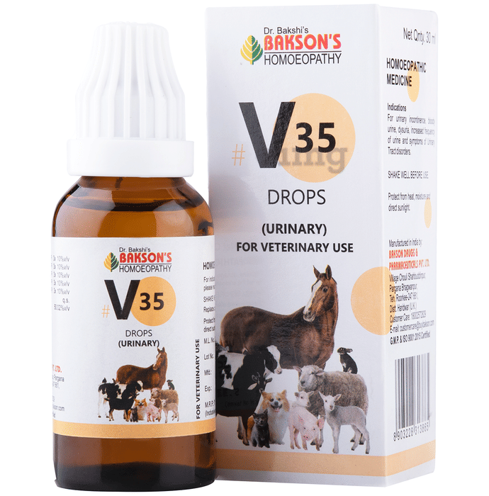 Dr Bakshi's Bakson's Homeopathy V35 Urinary Drops is a liquid formula developed for veterinary use. It is designed for use in cases showing symptoms of urinary tract discomfort such as increased frequency of urination, dysuria, or urinary incontinence. The formulation contains specific ingredients. The drops can be administered to both small and large animals and come in an easy-to-use dropper bottle.