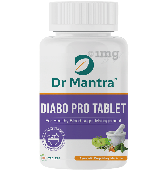 Dr Mantra Diabo Pro Tablet is an Ayurvedic proprietary formulation that may help support balanced blood sugar levels with the help of plant extracts. It contains a synergistic blend of herbs such as Gudmar, Jamun, Karela, and Amla which have potential metabolic and wellness properties. With ingredients that can help maintain glucose metabolism and digestive health, Diabo Pro Tablet can be suitable for individuals seeking long-term sugar balance support. This formulation also includes ingredients like turmeric, belpatra, trikatu, and bitter melon which may help contribute to digestive strength and vitality. It is designed to be gentle on the stomach and may help in daily sugar wellness when taken regularly as part of a balanced lifestyle.