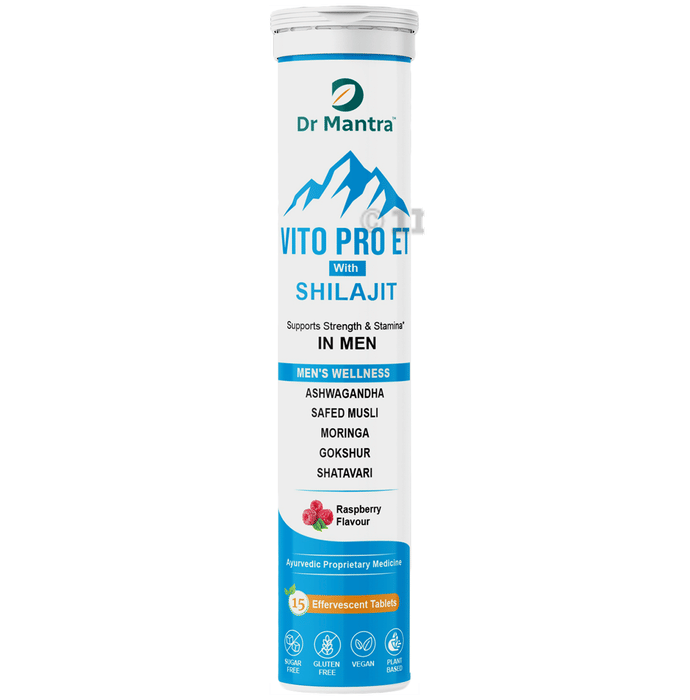 Dr Mantra Vito Pro ET with Shilajit Effervescent Tablet Raspberry is an Ayurvedic proprietary formulation designed to help support men's wellness through a blend of powerful botanical extracts. Crafted with a combination of Ashwagandha, Shatavari, Shilajit, Safed Musli, Gokshur, Moringa, and other herbs, this effervescent tablet may help contribute to supporting stamina, strength, vitality, and overall rejuvenation. It dissolves easily in water, providing a convenient, flavourful drink that can become part of your wellness regimen. The formulation can be suitable for those seeking gentle herbal support to adapt to daily stress, physical exertion, or general tiredness.