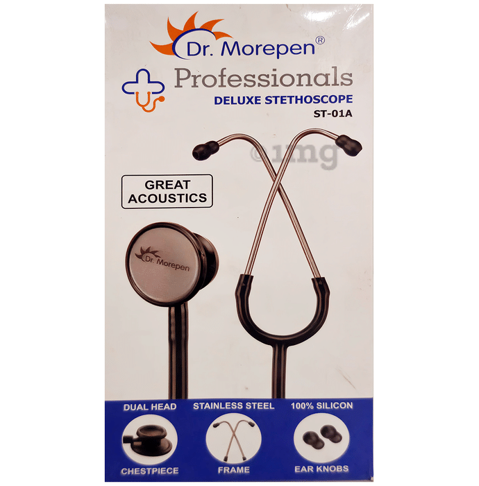 Dr Morepen ST01 The Professional's Deluxe Stethoscope has a chrome-plated chest piece with a special diaphragm. It is a compact, dual-frequency stethoscope with a smooth PVC tube. It has an open spring framework and soft earballs with chrome-plated chromium.