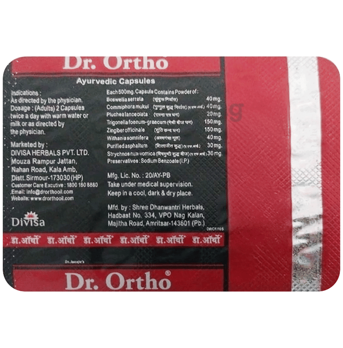 Dr Ortho Capsule is an ayurvedic formulation wth kunduru, guggul shuddh, rasna, methi, sunth, ashwagandha, vishamuthi, and shilajit shudh, which help improve the metabolic rate in the body while eliminating toxins from the body that might cause joint issues. Rasna in the capsule help remove toxins from the body. Ashwagandha has anti-inflammatory properties.