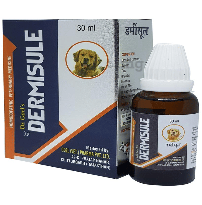 Dr. Goel's Dermisule Drop (For Pets) is a homoeopathic medicine that works naturally to provide relief from skin conditions in pets. It is safe to use along with other medicines.