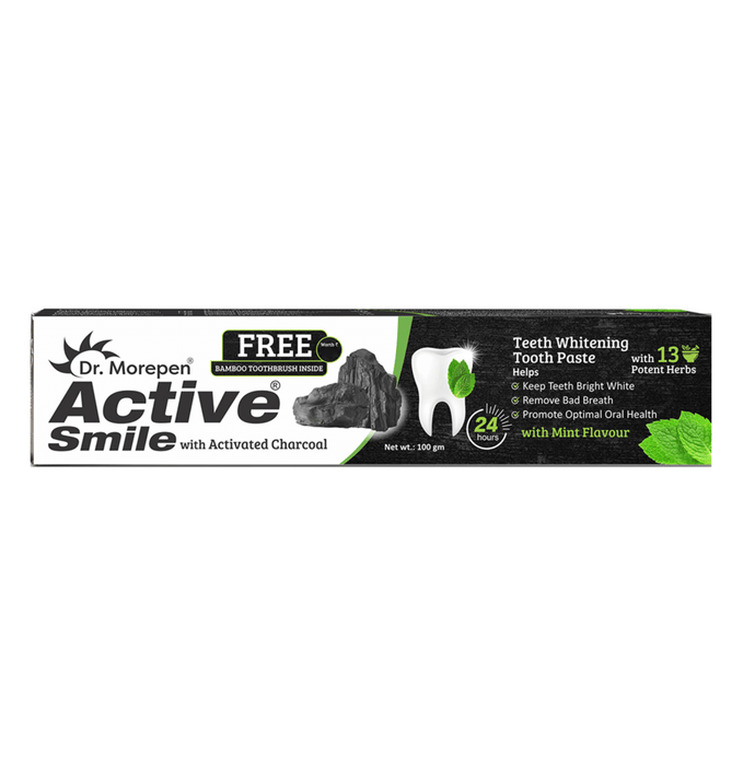 - Take a pea-size amount of Dr. Morepen Active Smile charcoal toothpaste on your toothbrush and gently brush for at least 2 minutes, twice a day