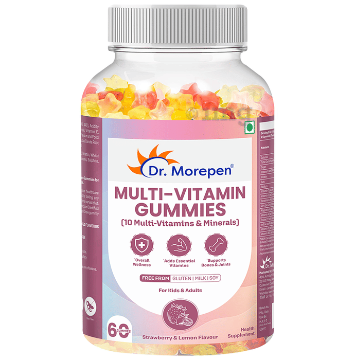 Dr. Morepen Multi-Vitamin Gummies Strawberry and Lemon Gluten Free is a health supplement formulated for kids and adults, containing a blend of 10 essential vitamins and minerals. Designed in a gummy form with a Strawberry and Lemon flavour, this product is free from common allergens and may help support daily nutritional intake, manage general tiredness, and maintain essential nutrient levels.