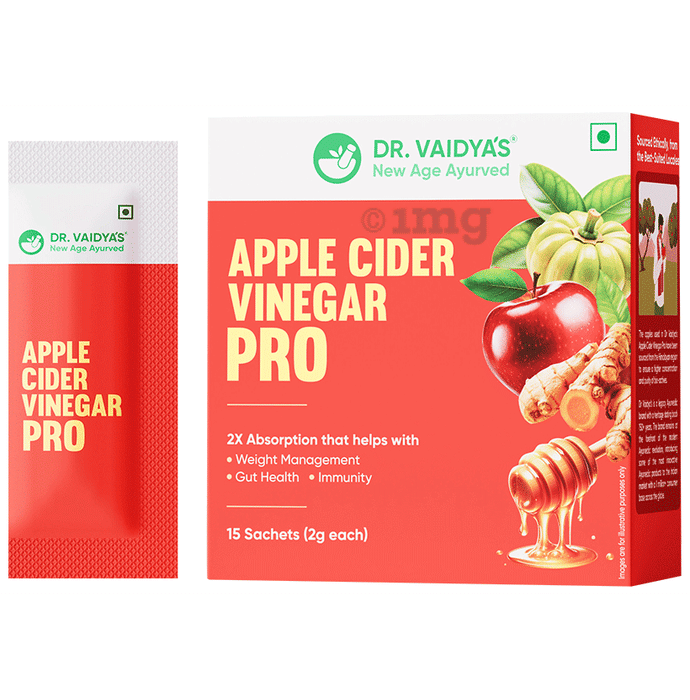 Dr. Vaidya's Apple Cider Vinegar Pro 2gm Sachet is a supplement designed to help offer potential support for weight management, digestion, and gut health. It contains a blend of Apple Cider Vinegar along with other beneficial herbal ingredients, which may help in metabolic balance and overall wellness. The formula is designed for enhanced absorption and ease of use.
