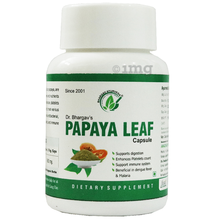 Dr.Bhargav’s Papaya Veg Capsule is a rich source of vitamins and minerals with digestive enzymes that can help manage intestinal disorders. It can help support digestive health and help increase platelet count. It contains antioxidant properties, which help fight free radicals in the body and anti-inflammatory and anti-fungal properties, which help fight diseases. It can also help enhance immunity.