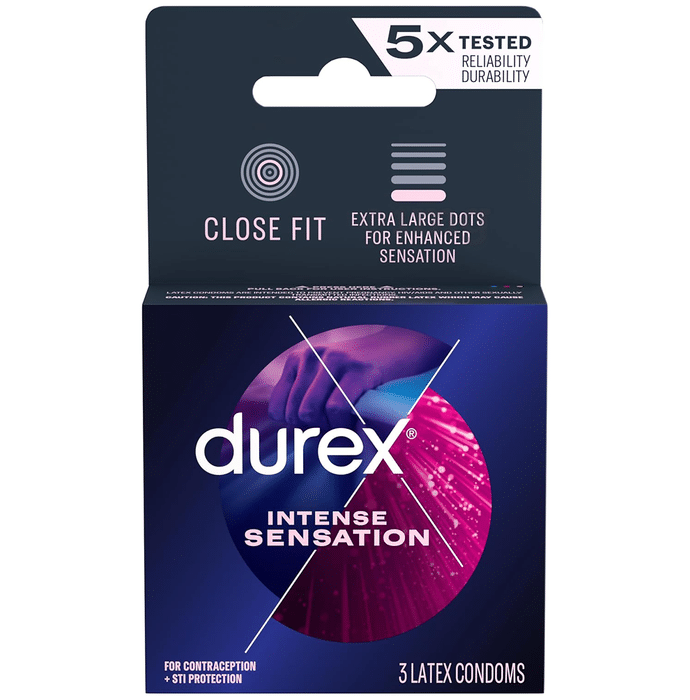 Durex Close Fit Intense Sensation Condom are designed to provide pleasure with hundreds of raised studs that can stimulate both partners during intimacy. Made from natural rubber latex, these lubricated condoms provide a comfortable and sensual experience while delivering the trusted protection of Durex. The low latex scent improves the overall experience, and each condom is electronically tested for strength and reliability to provide safe use.