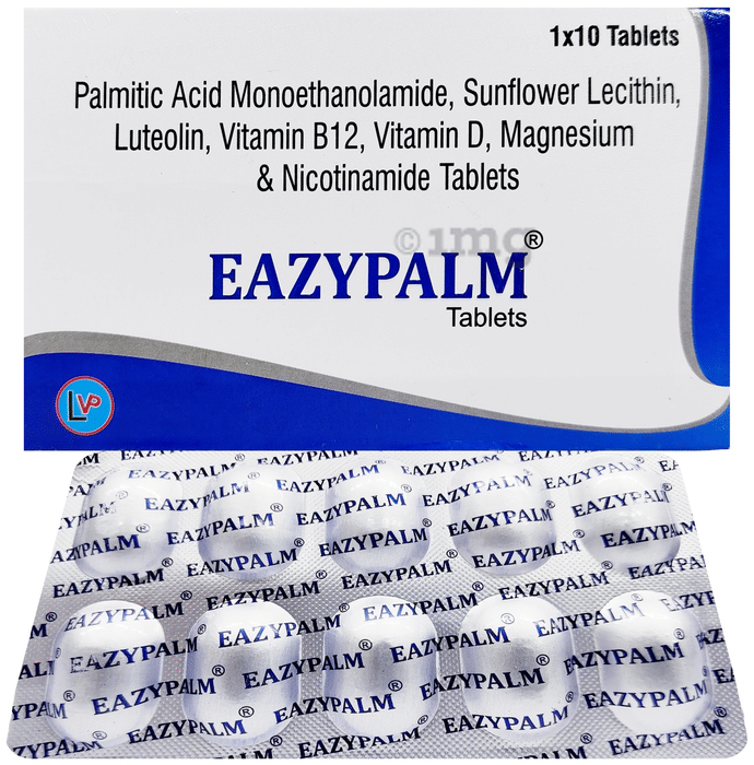 Eazypalm Tablet contains palmitic acid monoethanolamide, lecithin, and luteolin, which can be helpful for inflammation. The tablet has antioxidant properties that help reduce oxidative processes and free radicals.