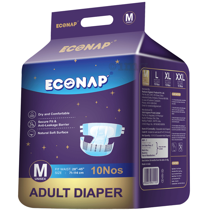 Econap Adult Diaper is a unisex hygiene product designed for adults seeking dry comfort, security, and skin-sensitive support. It is equipped with breathable materials, double tape closures, and a 3D leak guard that collectively helps manage incontinence with ease. The diaper’s ADL (Acquisition Distribution Layer) helps in spreading fluid and managing rewetting for prolonged dryness. This pack of 10 diapers is suitable for offering convenience during both day and night use.