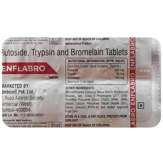 Enflabro Tablet is a dietary supplement that combines the benefits of Rutoside, Trypsin, and Bromelain and may help to support overall health and well-being. These ingredients are known for their potential role in promoting physical health and helping various bodily functions. Enflabro tablets are film-coated and designed for easy consumption, contributing to a healthy and active lifestyle.