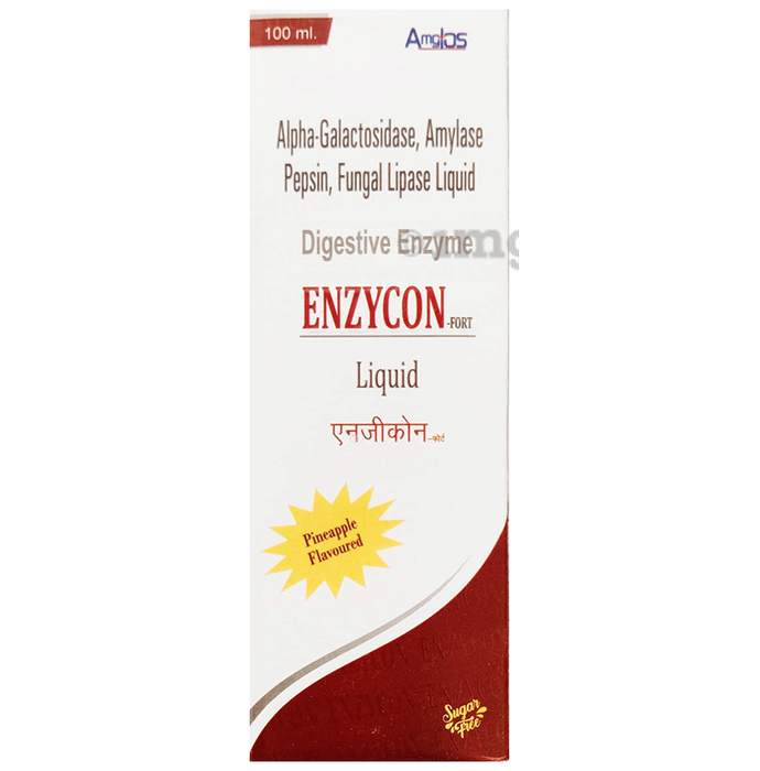 Enzycon Fort Liquid Pineapple Sugar-Free is a sugar-free, digestive-enzyme-induced formula in a delicious pineapple flavour. It contains a blend of alpha-galactosidase, amylase, pepsin, and fungi lipase, designed to support digestion and alleviate discomfort from the digestive system.