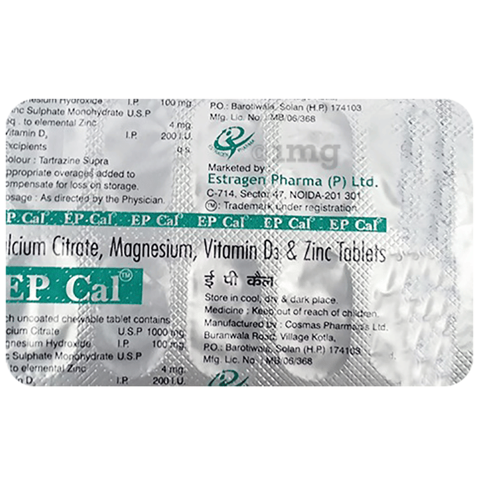 Epcal Tablet is a combination supplement that contains calcium, vitamin d3 (cholecalciferol), magnesium, and zinc. It is primarily used as a bone and joint supplement. Epcal Tablet is also used to treat deficiencies of these nutrients and may contribute to overall well-being.
