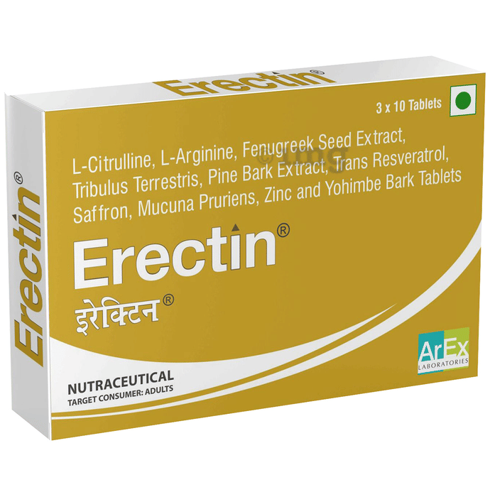 Erectin Tablet: Erectin Tablet helps to provide essential nutrients to the body. It contains L-arginine which helps to boost the immune system and gets converted into nitric oxide (when taken as a supplement), which widens the blood vessels and improves blood flow. This formula strengthens the body. Key Ingredients: L-Citrulline,L-Arginine,Fenugreek Seed Extract,Tribulus Terrestris,Pine Bark Extract,Trans-Resveratrol,Saffron,Mucuna Pruriens,Zinc,Yohimbe Bark Key Benefits: