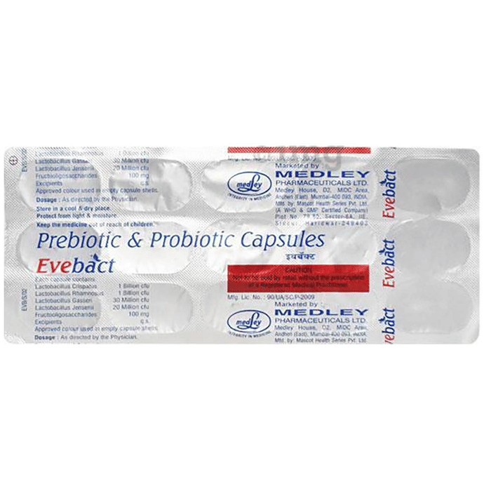 Evebact Capsule contains Fructooligosaccharides, Lactobacillus gasseri, and Lactobacillus rhamnosus as active ingredients