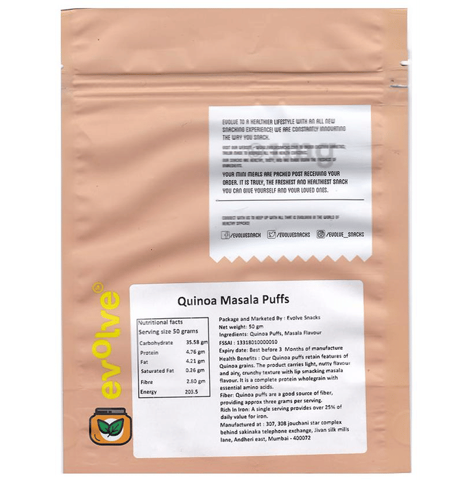Evolve Quinoa Masala Puffs are a tasty and healthy snack option that is made with natural ingredients. The key ingredient of these puffs is quinoa, a superfood that is rich in protein, fibre, and essential nutrients. These puffs are seasoned with a blend of aromatic spices flavor.