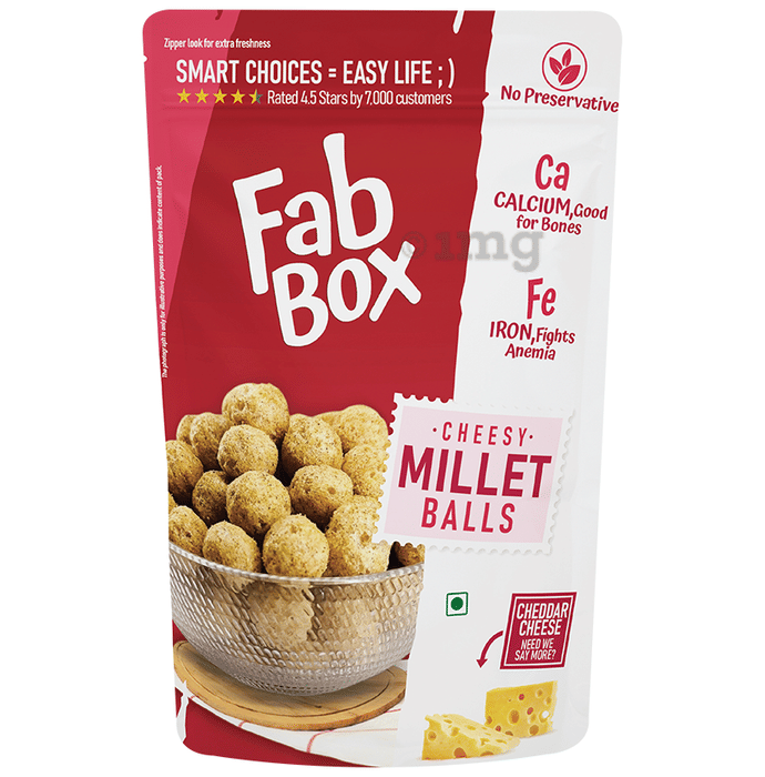 Fabbox Cheddar Cheese Millet Balls are crunchy, savoury bites made with wholesome millet and chickpea flour, blended with milk solids and cheddar cheese powder for a delightful snack experience. With no preservatives and a rich nutrient profile, these millet balls combine functionality and flavour in one pack. These balls can support daily dietary routines with the benefits of whole grain jowar and rice bran oil. Ideal for individuals looking to manage their intake with a balanced, crunchy option.