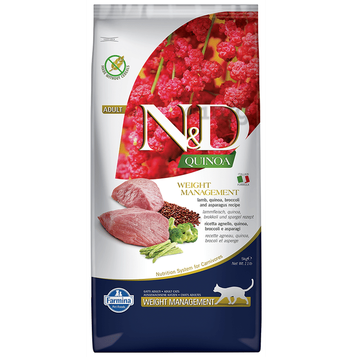 Farmina Pet Foods N&D Quinoa for Adult Cat Weight Management is a complete cat food recommended for reducing excessive body weight. It is an excellent source of fibre, folate, vitamins A, C, E and K, antioxidants, and chromium, a trace mineral present in the diet.