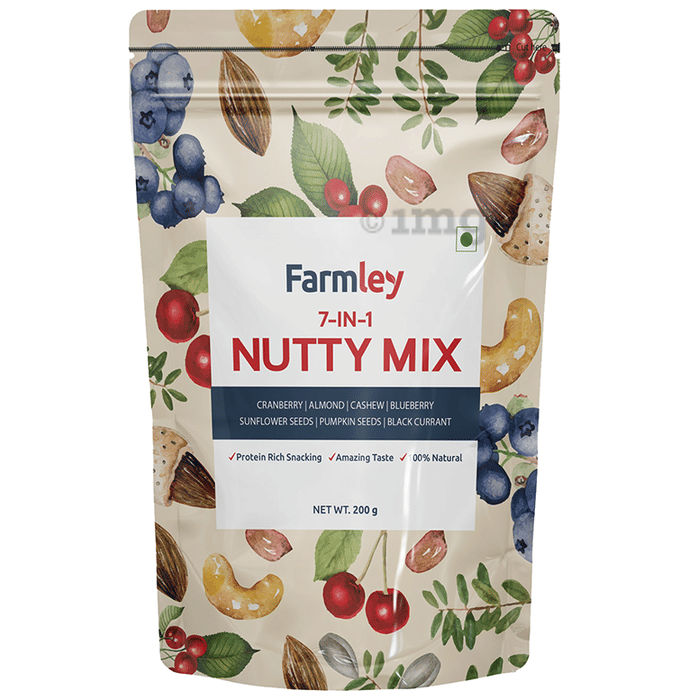 Farmley 7-In-1 Nutty Mix made with only natural ingredients: high-quality roasted seeds and natural dried fruits. All roasted and made super-crunchy for a low in calorie and high in nutrition snack. This snack is completely oil and butter-free. All the ingredients are roasted in rock salt at high temperatures.