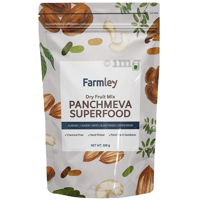 Farmley Dry Fruit Mix Panchmeva Superfood is packed with vegan proteins and high dietary fibre. Almonds and cashew nuts are a powerhouse of omega-3, omega-6 fatty acids, and antioxidants that increase energy levels. It has no artificial additives, no chemicals, and no preservatives. It is just 100% naturally sourced and flavourful nuts.