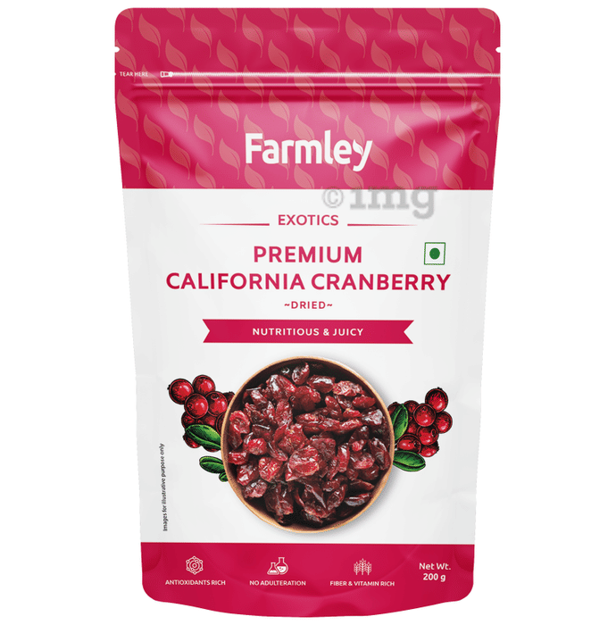 Farmley Exotics Premium California Cranberry Dried Cranberries are rich in nutrients and antioxidants, making them a popular superfood. Dried cranberries have no trans-fats, saturated fats and cholesterol. They help improve blood pressure and cholesterol; and are also known to help in the possible prevention of breast cancer in women.