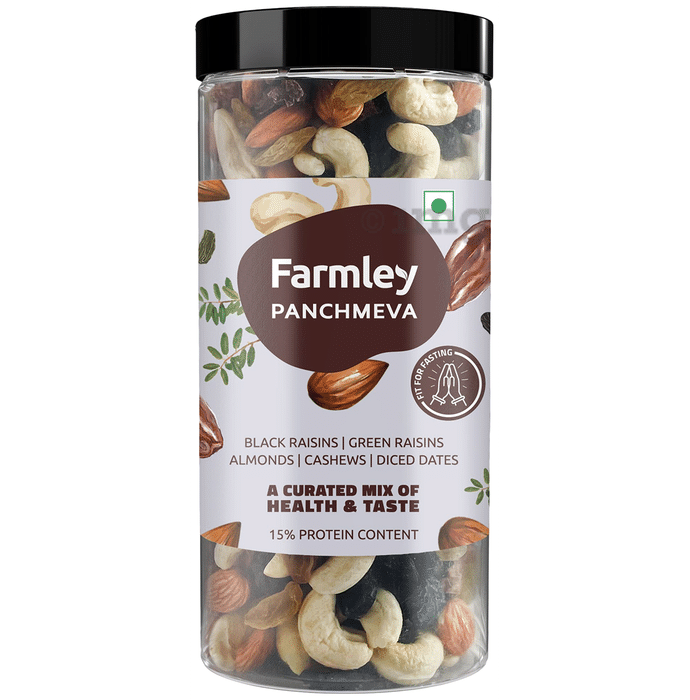 Farmley Panchmeva is a carefully selected combination of five premium dry fruits and nuts—almonds, cashews, green raisins, black raisins, and dates. This blend is naturally packed with essential nutrients, making it a convenient and wholesome snacking option. With no added preservatives, it serves as a natural energy source suitable for various dietary preferences. Enjoy it straight from the pack or incorporate it into cereals, smoothies, baked goods, or salads for added texture and taste.