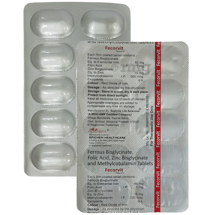Fecorvit Tablet is a iron supplement which helps in increasing blood formation and maintains the overall health. It is useful in performing normal body functions, make up the deficiencies in the body and protection of cells from wear and tear.