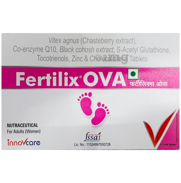 Fertilix Ova Tablet Fertilix Ova Tablet is a dietary supplement containing Chaste Berry Extract, Coenzyme Q10, Black Cohosh, Tocotrienols, and Zinc, which provide antioxidant support and general wellness nutrition. Key Ingredients: Chaste Berry Extract – 400 mg,Coenzyme Q10 – 200 mg,Black Cohosh – 120 mg,Zinc Bisglycinate (equivalent to Zinc) – 16 mg,S-Acetyl Glutathione – 100 mg,Cholecalciferol – 600 IU,Tocotrienols – 30 mg Key Benefits: