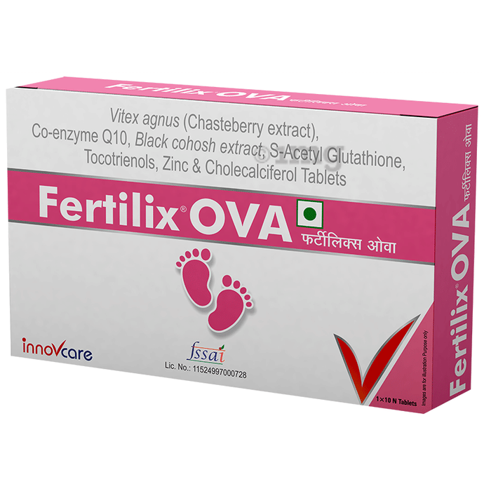 Fertilix Ova Tablet is a dietary supplement containing Chaste Berry Extract, Coenzyme Q10, Black Cohosh, Tocotrienols, and Zinc, which provide antioxidant support and general wellness nutrition.