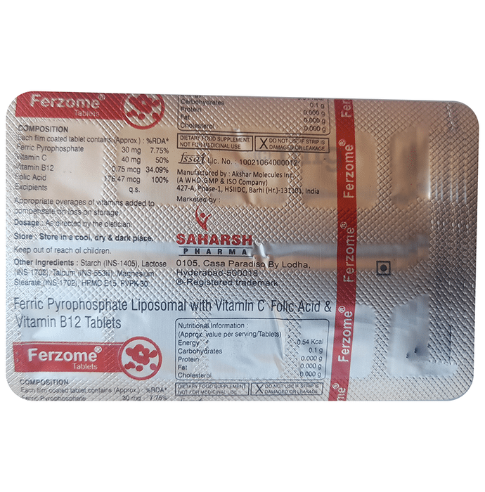 Ferzome Tablet is a nutritional supplement that enhances cell metabolism and boosts energy levels.