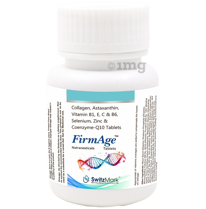 FirmAge Tablet is a nutritional formulation containing collagen peptides, antioxidants, vitamins, and minerals. It is designed to support skin, hair, nail, bone, and joint health. The combination of collagen, coenzyme Q10, astaxanthin, and essential micronutrients may help contribute to overall wellness and vitality.
