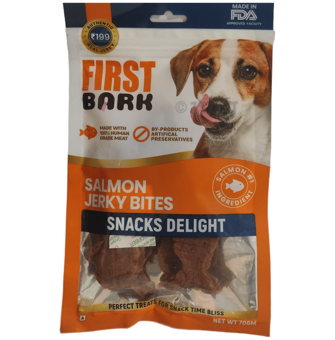 First Bark Salmon Jerky Bites / Snacks Delight are tasty treats prepared with salmon and chicken as the main ingredients. These jerky bites are designed in convenient pieces, making them easy for dogs to enjoy. The product contains protein and essential nutrients in a simple chew format that can be included in daily snacking.