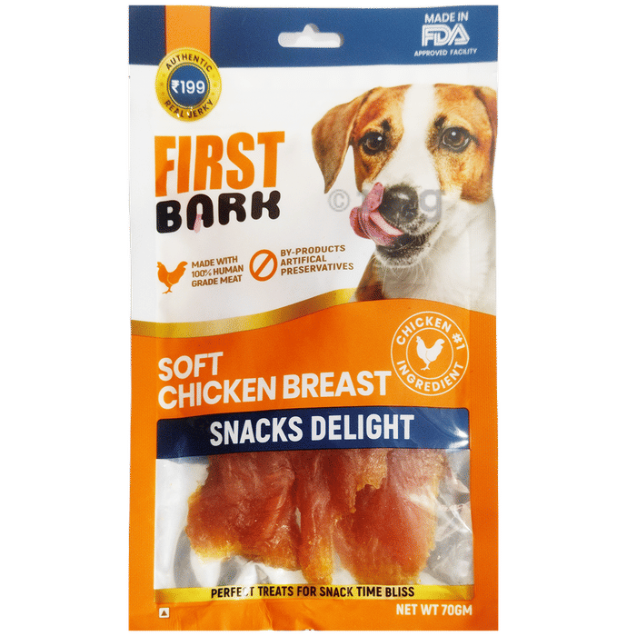First Bark Soft Chicken Breast / Snacks Delight is a protein-rich snack prepared with real chicken breast. These treats are designed as soft jerky pieces that make chewing easier for dogs of different sizes. The product provides nourishment in a simple snack format that can be included as part of a dog’s feeding routine.